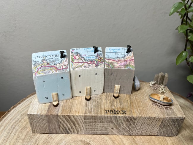 The cottages are handpainted in neutral tones with the roofs decorated with an original vintage map of your chosen location.